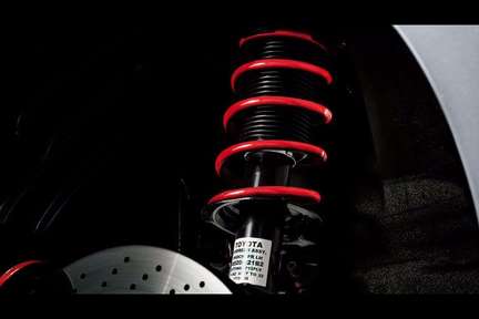 専用大径ベンチレーテッドディスクブレーキ(フローティング〈フロントのみ〉・ドリルドディスク)+モノブロック対向フロント6ポット・リヤ4ポットキャリパー(レッド塗装/GRロゴ付)