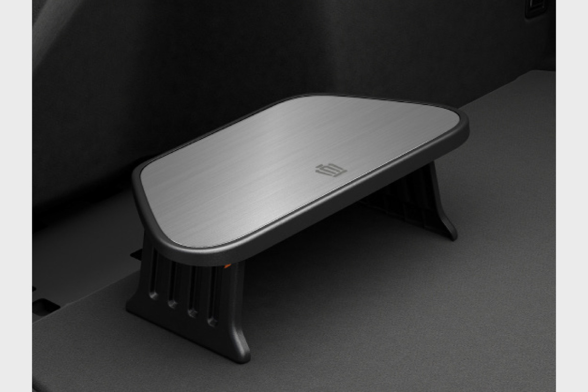 デッキサイドカバーを兼ねる脱着可能な折りたたみ式テーブル。車内外で使用できるため、車中泊や野外キャンプなど、様々なシーンで活用できます。