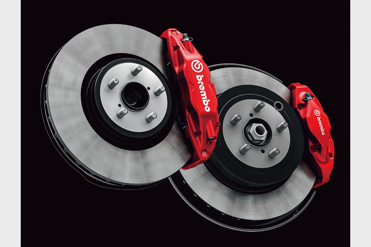 キャリパーには、フロント対向4ポット・リヤ対向2ポットを採用。大径化したローターは放熱性と耐フェード性を向上しました。高い冷却性能とあわせて、ハードな状況においても安定した制動力を発揮します。また、応答性の高いブレーキブースターとともに、ペダルの踏み込みに応じたリニアな効き味をもたらし、優れたコントロール性能を実現しました。