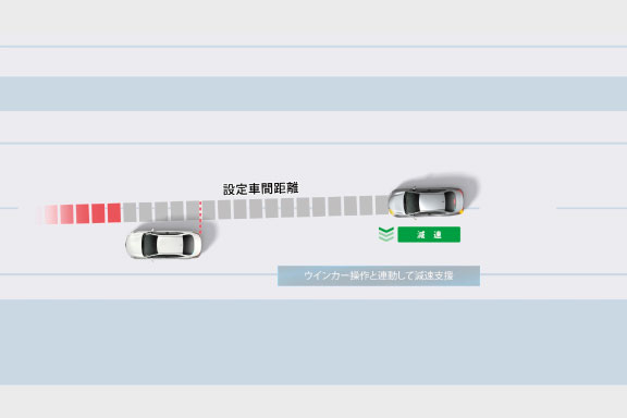 レーダークルーズコントロール使用中にウインカー操作をした際、遅い先行車を追い越すための予備加速、または車線変更先にいる遅い先行車に追従するための予備減速を実施し、スムーズな追い越しや車線変更を行います。